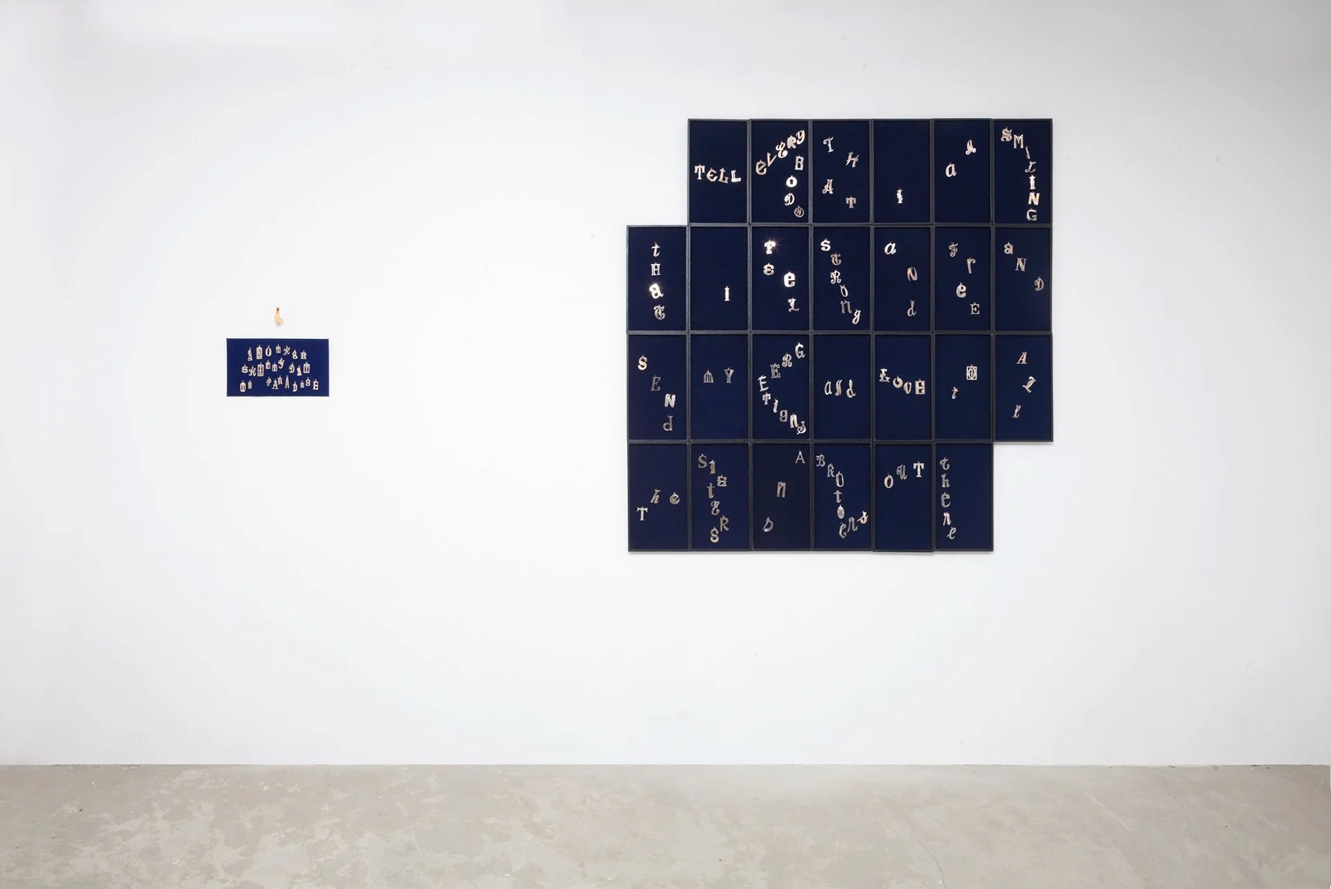 Tell Everybody That I Am Smiling (Stockholm Syndrome), 2015 Hand cut .925 silver pendants, velvet, cardboard 67 x 57 x 1.2 in. / 170 x 145 x 3 cm
